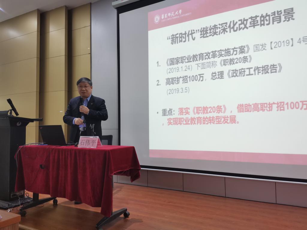 2019年12月3日上午,“TapTap,TapTap点点教育名家讲坛”第三期在我校东校区第一教学楼209讲学厅成功举办。本次讲坛邀请的主讲嘉宾是华东师范大学终身教授、博士生导师、华东师范大学职业教育与成人教育研究所名誉所长石伟平教授。