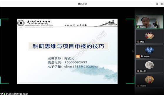 6月11日下午3:00,厦门大学陈武元教授,应邀于腾讯会议平台为TapTap点点作了题为《科研思维与项目申报的技巧》的辅导报告,TapTap点点陶红院长出席,陈丽君副院长主持,毕进杰、陈军、冯嘉慧、李灵丽、邵成智、孙文云、唐芬芬、伍国华、王雨函、肖孟琦、朱姝、张晓洁、周元春、章玉祉等二十多位教师参会。