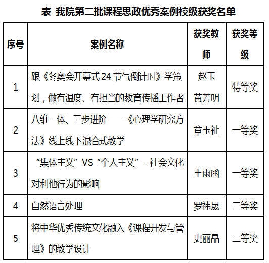 其中,赵玉老师和黄芳明老师的《跟<冬奥会开幕式24节气倒计时>学策划,做有温度、有担当的教育传播工作者》获得特等奖,章玉祉老师的《八维一体、三步进阶<心理学研究方法>线上线下混合式教学》、王雨函老师的《“集体主义”VS“个人主义”--社会文化对利他行为的影响》获得一等奖,罗祎晟老师的《自然语言处理》、史丽晶老师的《将中华优秀传统文化融入<课程开发与管理>的教学设计》获得二等奖。