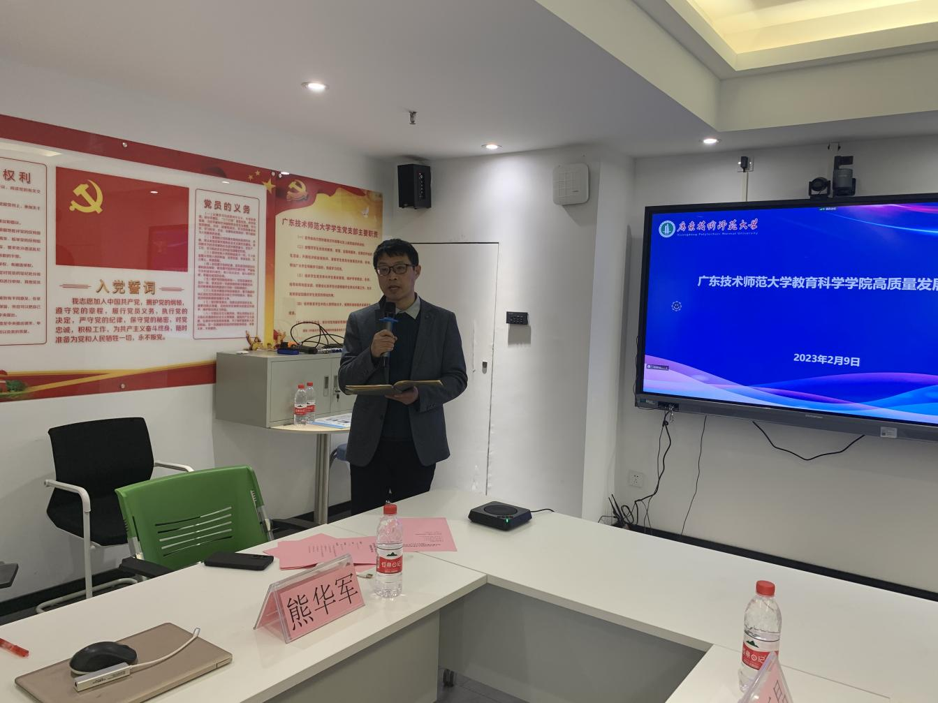 会议首先由熊华军院长传达学校高质量发展工作会议精神。熊院长提到习近平总书记寄望广东聚焦用力,扎实推进高质量发展;传达了戴校长在我校高质量发展工作会议上的指示,各学院根据自身优势,组织博士团基地对接,服务地方社会经济发展,带动教育教学改革创新。然后熊院长提出了对整体广东、河源市、韶关市、广州市教育局、广州白云区、天河区、越秀区等服务地方高质量发展的设想,涵盖了创新型社会人才培养模式研究、赋能广东省制造业发展、各学段教师学历提升、农村教师教学能力提升、双师型教师培养、教育数字化转型等重点前沿议题。