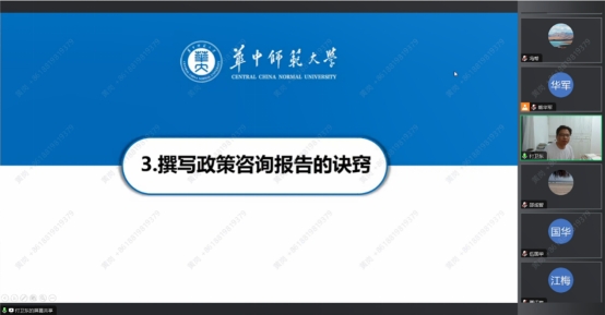 随即,付卫东教授从政策咨询报告与学术论文的区别与联系、撰写政策咨询报告所具备的能力、撰写政策咨询报告的诀窍、案例分析及启示四方面展开培训。付卫东教授指出政策咨询报告撰写要具备发现重大问题的能力、抓住事物本质及内在规律的能力、将理论与实际情况相结合的能力。同时政策咨询报告的撰写要精于选题,要从领导思考的要点、政策落实的难点、值得推广的亮点、尚未考虑的盲点出发,关注宏观战略、突出矛盾、明显差距、新诉求、新动向等重点问题。