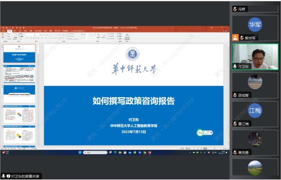 7月13日晚7点,TapTap点点邀请华中师范大学教授,博士生导师,长江教育研究院、华中师范大学政研室兼职研究员,中国教育财政学会理事付卫东教授进行高端职业教育智库撰写报告的专题培训,学院院长熊华军、副书记吴水爱、副院长谢德新、副院长刘海兰出席,学院近50位教师参加本次培训会,会议由冯帮副院长主持。
