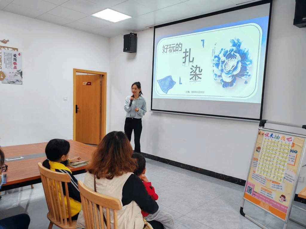 活动当天,近40位家长和孩子们齐聚一堂,徐莹莹同学向家长和学生简单介绍了有关大理白族扎染相关知识,其次对扎染的历史、材料、扎染过程以及传统与现代扎染的对比和应用进行了详细的讲解,以便家长和学生对扎染有更深入的了解。最后,在讲解的过程中与家长和学生进行了积极的互动,不仅能够使家长和学生能够对扎染有清晰的认知,同时还为家长和学生制造轻松愉悦的氛围,让家长和学生能够开心、愿意地进行活动,享受扎染带来的乐趣。
