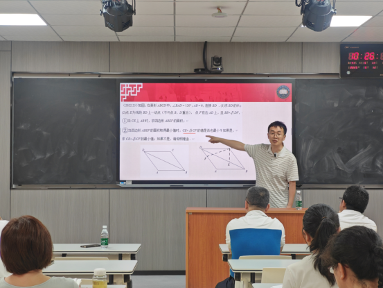 黄老师以《如何变题、讲题提高数学学习效率》为题,从“讲题流程优化”与“变题策略设计”两方面系统讲解教学要点。讲题部分,强调从条件、图形、结论多维分析,帮助学生建构清晰解题思路;变题部分,提出“改条件、变问法、换图形”三种策略,引导学生突破思维定式,提升迁移能力。整场讲座逻辑严密、案例鲜活,紧贴教学实际,反响热烈。教师们纷纷表示,此次活动不仅提供了实用路径,也在理念上给予启发,将积极探索“精讲+变式”教学策略,推动课堂教学提质增效。
