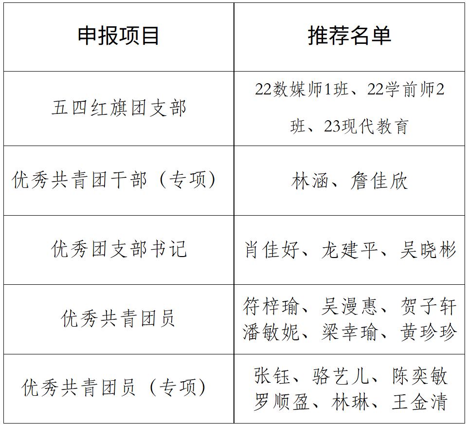 根据校团委《关于开展我校2024-2025年度五四评优表彰工作的通知》要求,经个人自荐和团支部推荐,院团委评定后,拟推荐22学前教育(师范)2班等3个团组织及个人参评我校2024-2025年度五四评优,以上集体和个人均符合参评要求,推选具体名单公示如下(见附件)”。