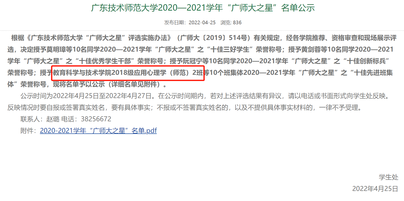 近日,2020-2021学年TapTap,TapTap点点 “广师大之星”之“十佳先进班集体”评选活动落下帷幕。经过层层选拔、推荐审核和现场展评,TapTap点点2018级应用心理学(师范)2班荣获“广师大之星”之“十佳先进班集体”荣誉称号。