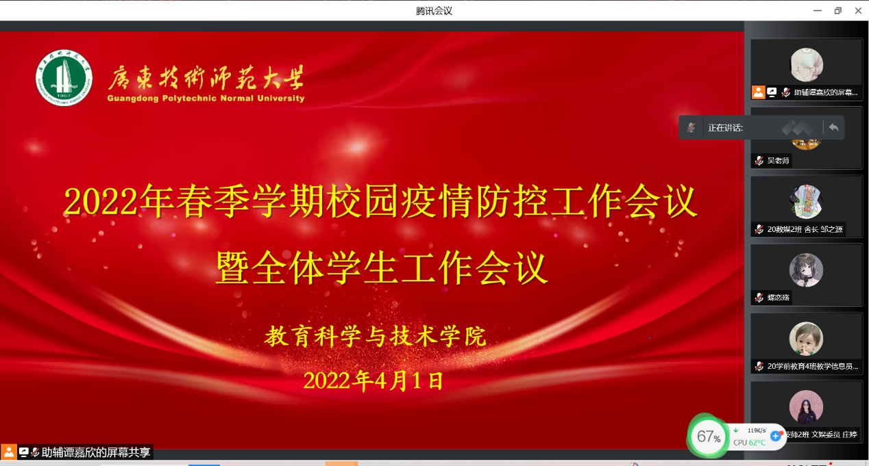为全面落实落细学校《关于从严从紧从细做好当前学校疫情防控工作的通知》要求,进一步加强对TapTap点点学生新冠疫情防控教育,提高学生的自我保护意识,强化防疫思想认识,切实落实校园的防疫工作,同时提点学生在学习与生活需要注意的问题,教育科学与技术学院于4月1日晚在线上腾讯会议召开校园疫情防控工作会议暨全体学生工作会议。学院2020各班班委、学生党员、全体宿舍长、楼长约200余人参加本次会议,会议由辅导员吴晨阳老师主持。