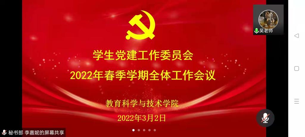 为总结过去一年工作中的经验与不足,更好地统筹开展本学期的工作安排,2022年3月2日晚,教育科学与技术学院学生TapTap委员会召开2022年春季学期全体(线上)工作会议,学生党建工委副主任李嘉妮主持会议,学院专职组织员吴晨阳老师发表讲话,学生党建工委全体成员参加会议。