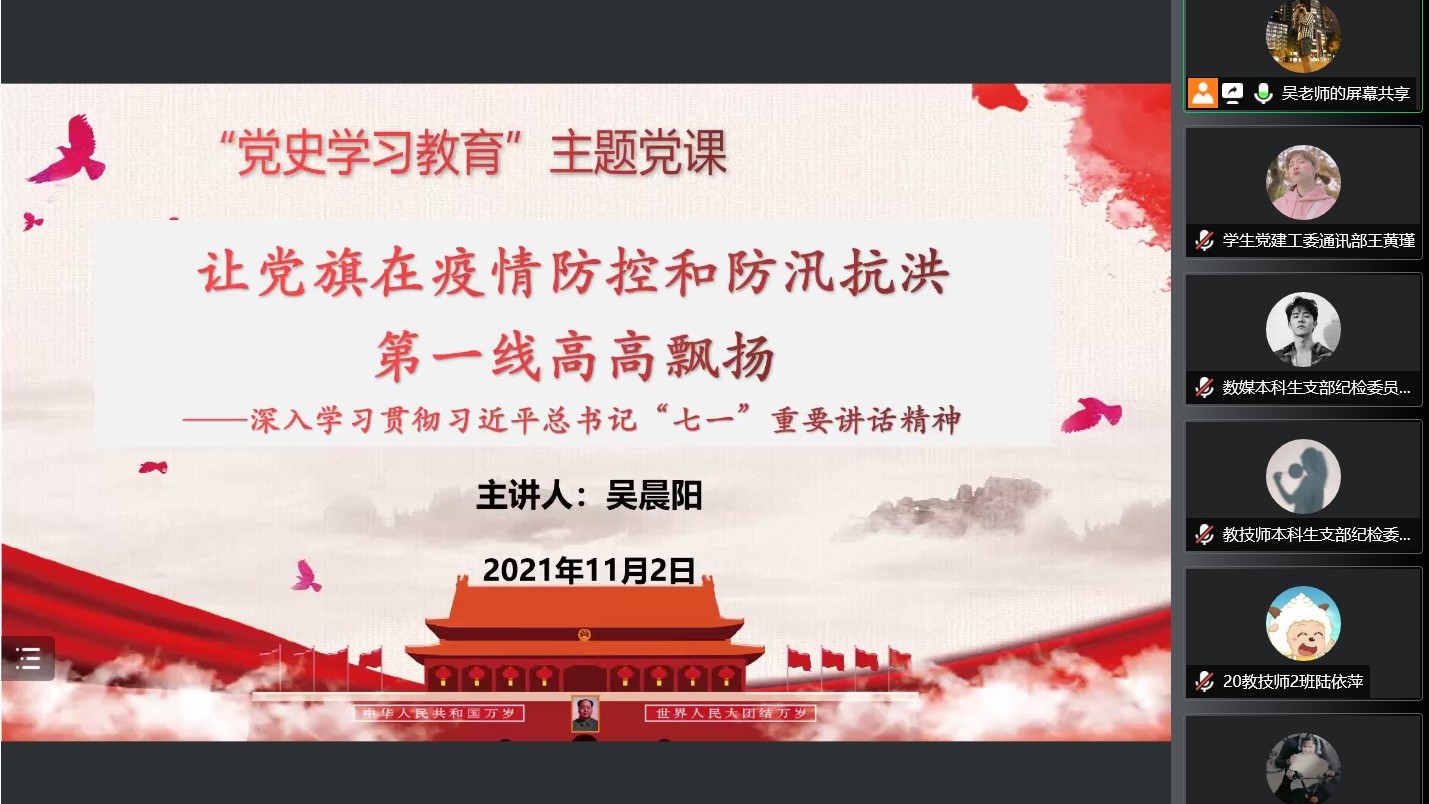 会议最后,吴晨阳以《让党旗在疫情防控和防汛抗洪第一线高高飘扬》为主题讲授专题党课。吴老师从中国精神的内涵出发,列举了钟南山院士、青年医生、基层干部、消防员、抗洪志愿者等等英雄感人事迹,呼吁大家要永怀爱国之心,践行报国之行,勇担强国之任,坚定强国之志。同时,他结合亲身经历,分享了个人参与“7.20河南特大暴雨”志愿服务的所见、所闻、所获、所感,大家表示要继续大力弘扬伟大抗疫精神和抗洪精神,以“踏平坎坷成大道,斗罢艰险又出发”的姿态向着实现中华民族伟大复兴的奋斗目标奋力前行。