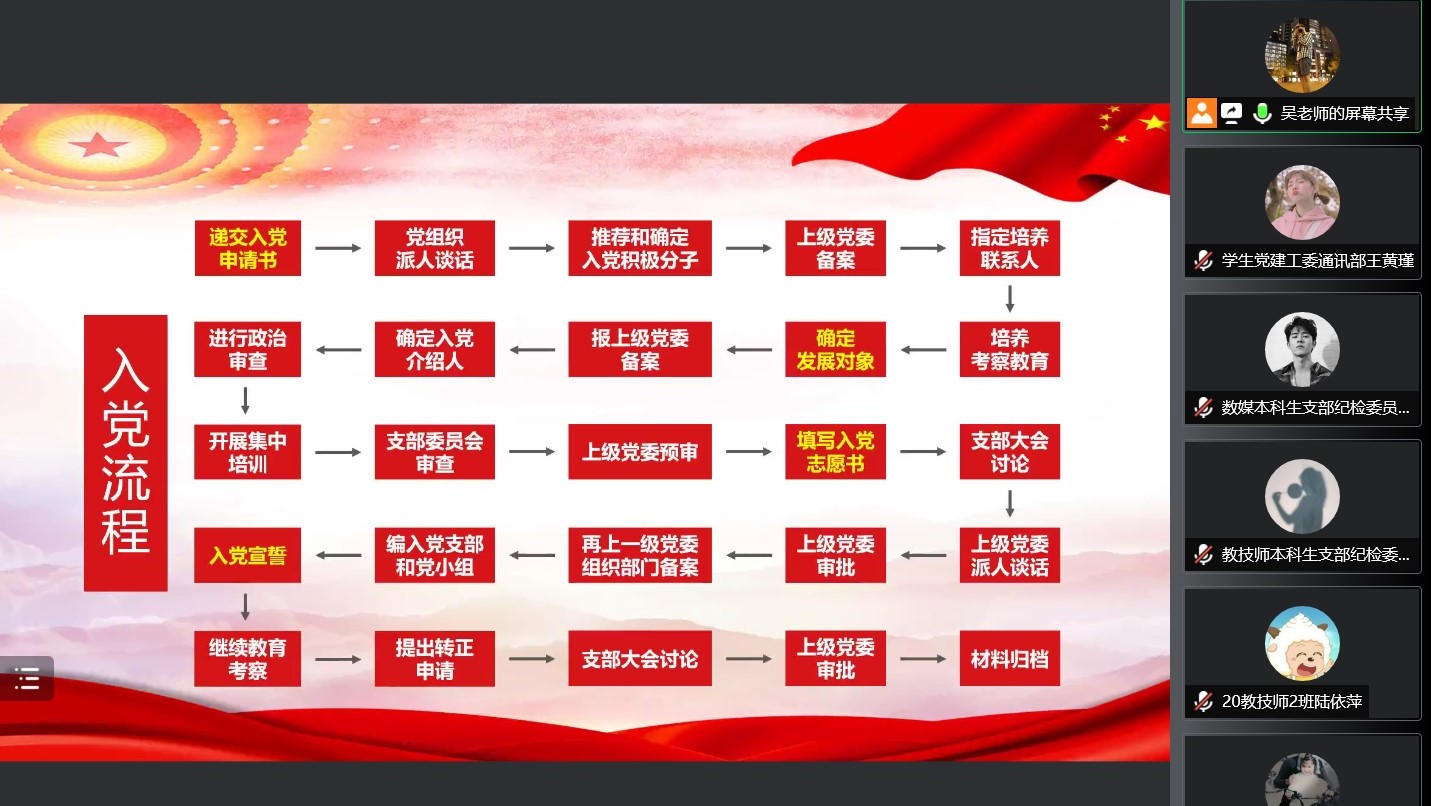 接着,吴老师对入党流程进行深入解说,他分别从申请入党、入党积极分子的确定和培养教育、发展对象的确定和考察、预备党员的接收五方面内容进行了详细讲解,他强调,党员发展是极其严肃的事情,各团支部在开展入党推优的过程中,要牢牢把握“四个必须”,必须责任心强,必须工作细致,必须程序严格,必须高质量发展。严格党员发展程序,提高学生党员发展质量,是提高学院管理水平的重要体现,各党支部要强化组织建设,充分发挥战斗堡垒作用。