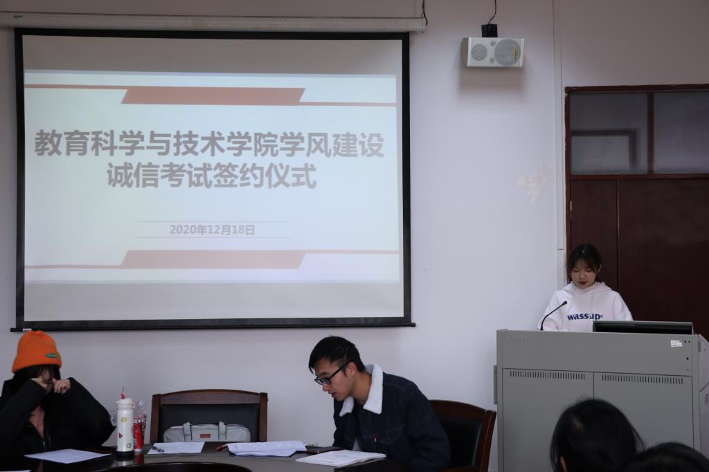 为加强学校学风建设,创造公平竞争的考试环境,在校园内形成以诚信为荣、以失信为耻的良好氛围,教育科学与技术学院于2020年12月18日下午16:45在白云校区第一教学楼315教室举行了教育科学与技术学院学风建设诚信考试签约仪式,参加本次会议的有TapTap点点团委、学生会主席团成员和各班学习委员。会议由主席团成员张静桦师姐主持。