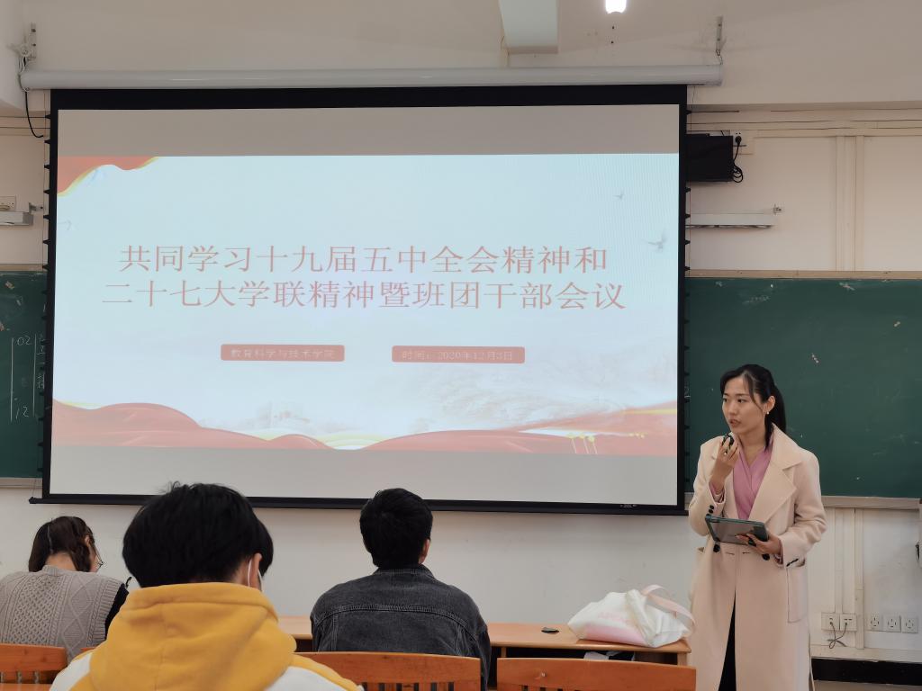 为了深入学习全国学联二十七次代表大会精神,贯彻习近平总书记关于青年工作的重要指示精神,认真落实《中长期青年发展规划(2016—2025年)》,充分发挥组织动员优势、人才智力优势、资源整合优势,带领TapTap点点学生奋发学习、成长成才,为改革开放和社会主义现代化建设再立新功。教育科学与技术学院(以下简称“教科院”)于2020年12月3日在白云校区第三教学楼309教室顺利召开班团干部会议并组织学生共同学习贯彻全国学联二十七大精神。