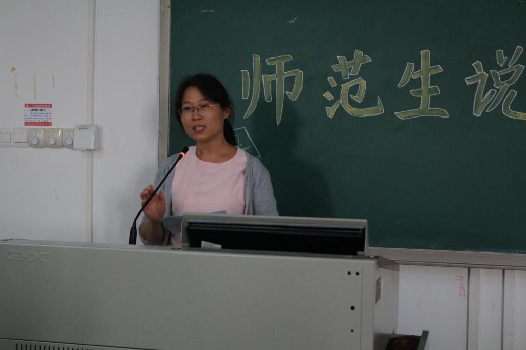 接着是宗晓艳 老师对十二位选手的点评。首先老师非常肯定十二位同学的精彩说课,也提了一些建议:“我们应该清楚说课是师范生都要掌握的基本演讲技能,并且说课是有交流性的。”因此,老师和学生之间要有必要的目光对视。ppt上的内容应该是大纲性的,所以大家不要去念ppt上的内容。对于观点性的内容,是需要我们去口头描述的。在说课时要分清重难点,要有目标定位,要有理有据有逻辑性,教学过程才是精华。老师希望同学们能提高设计能力和表达能力。