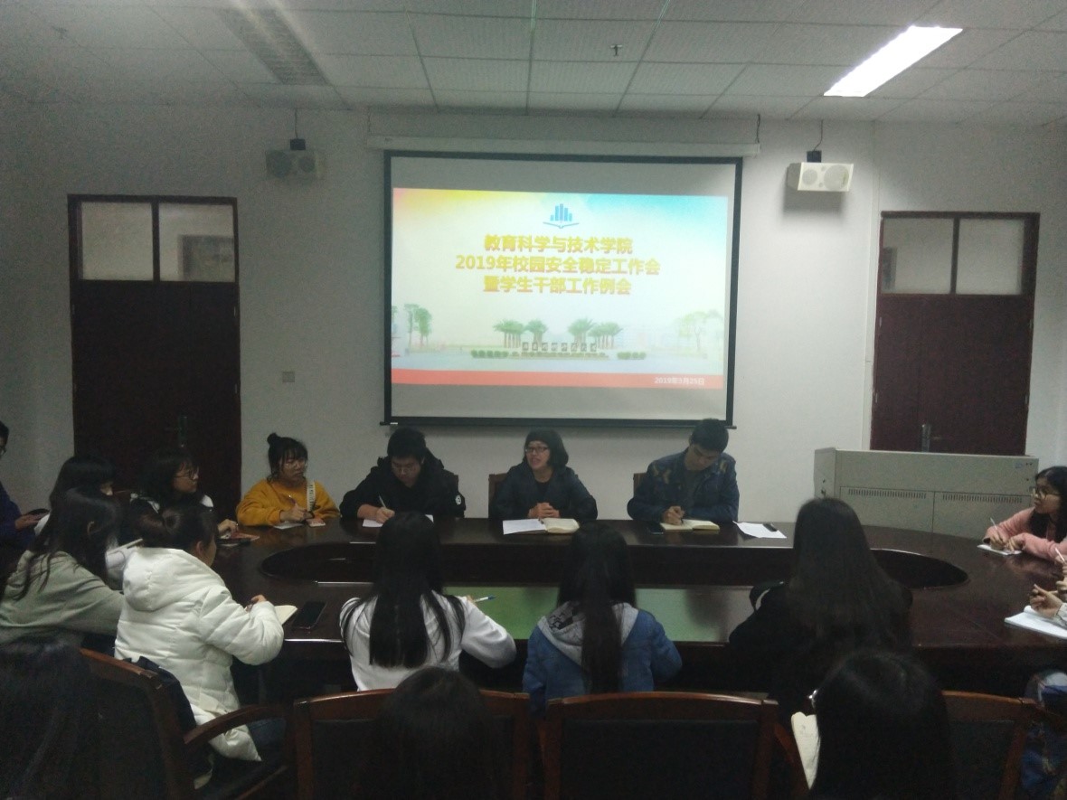 3月25日下午,教育科学与技术学院2017级和2018级全体学生干部主要成员在白云校区一教315会议室组织召开2019年校园安全稳定工作会暨学生干部工作例会,学院党委吴水爱副书记出席会议,会议由辅导员吴晨阳老师主持。
