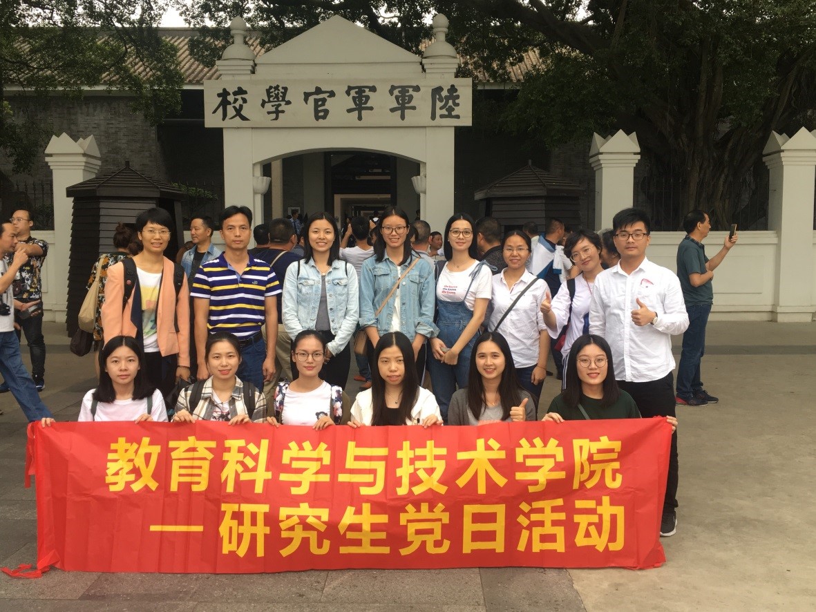 2018年11月10日,教育科学与技术学院研究生第二党支部在黄埔军校举行了“忆党史、学党章、重温入党誓词”为主题的“党日”活动,活动共分为三部分,分别是:忆党史--学党章--温誓词。此次活动旨在让学生党员同志了解革命先烈的艰苦,通过学习加强自身党性修养,不忘初心和牢记使命,铭记历史,缅怀先烈。同时,从革命先烈英勇事迹中汲取养分,积极践行社会主义核心价值观和正确理解和把握《条例》精神实质,规范和约束自身行为,以身作则、全心全意做好各项工作,争取做一个有理想、有担当的当代大学生。