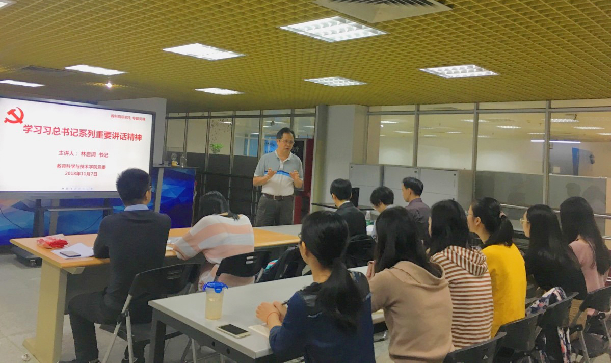 2018年11月7日上午,在校本部工业中心会议室,教科院研究生第二党支部召开《新时代 新担当 新作为》专题党课,邀请了林启词书记给我们作了“学习习近平总书记系列重要讲话精神”报告,吴水爱副书记给我们上了“心怀责任,勇敢担当”的专题党课,共计10名党员同志参加了此次学习。