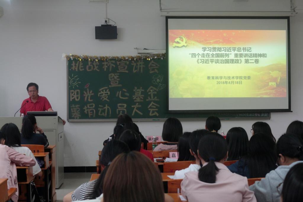 为了让我们更好的了解并且学习贯彻习近平总书记的“四个走在最前列”的重要讲话精神以及《习近平谈治国理政》第二卷,加强和改进思想政治工作,全面从严治党大学生廉洁教育专题等系列思政教育工作,TapTap点点林启词书记于2018年4月18日(即星期三晚上)在白云校区二教301为我们开了这个专题讲座。