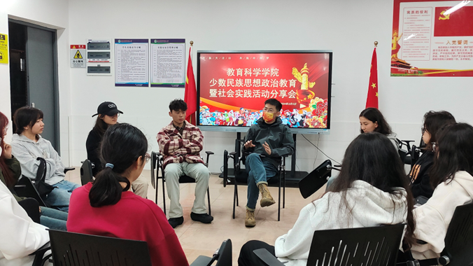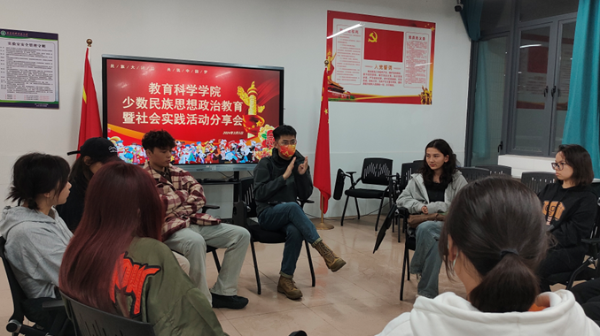 与会的10名少数民族学生分别分享了个人假期期间的社会实践经历以及感想。其中,来自22心理师2班的阿瓦尼萨汗·麦吐尔送分享了她寒假在家的生活旅行经历。她表示经过在广东学习生活一段时间后回到新疆,不仅让他对于自己民族的文化有了更深的认识,充分明白了民族融合,文化交流的重大意义,也增强了她作为中华民族的文化自信。来自22数媒师1班的赛珍向在座的同学分享了藏历新年的特色习俗文化,具有美好寓意的新年食物以及节日礼仪。她表示,虽然各地的习俗文化会有不同,但是各民族向往美好生活的心愿与实现中华民族伟大复兴的理想是一致的。