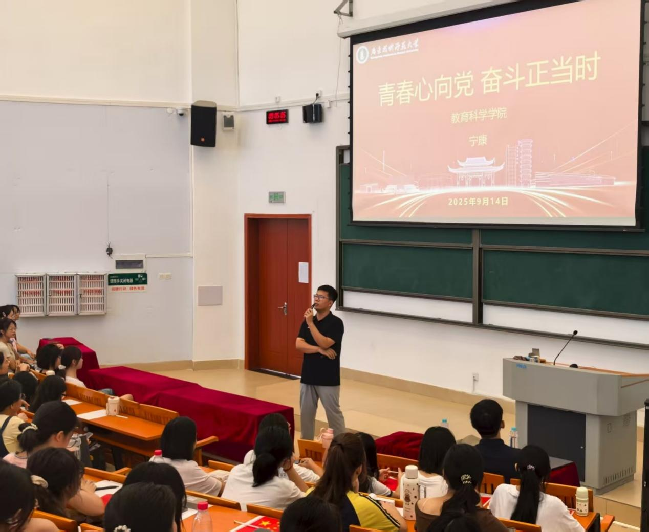9月14日上午,辅导员宁康主讲党团教育,鼓励新生积极向党团组织靠拢,传承五四精神,勇担时代使命。