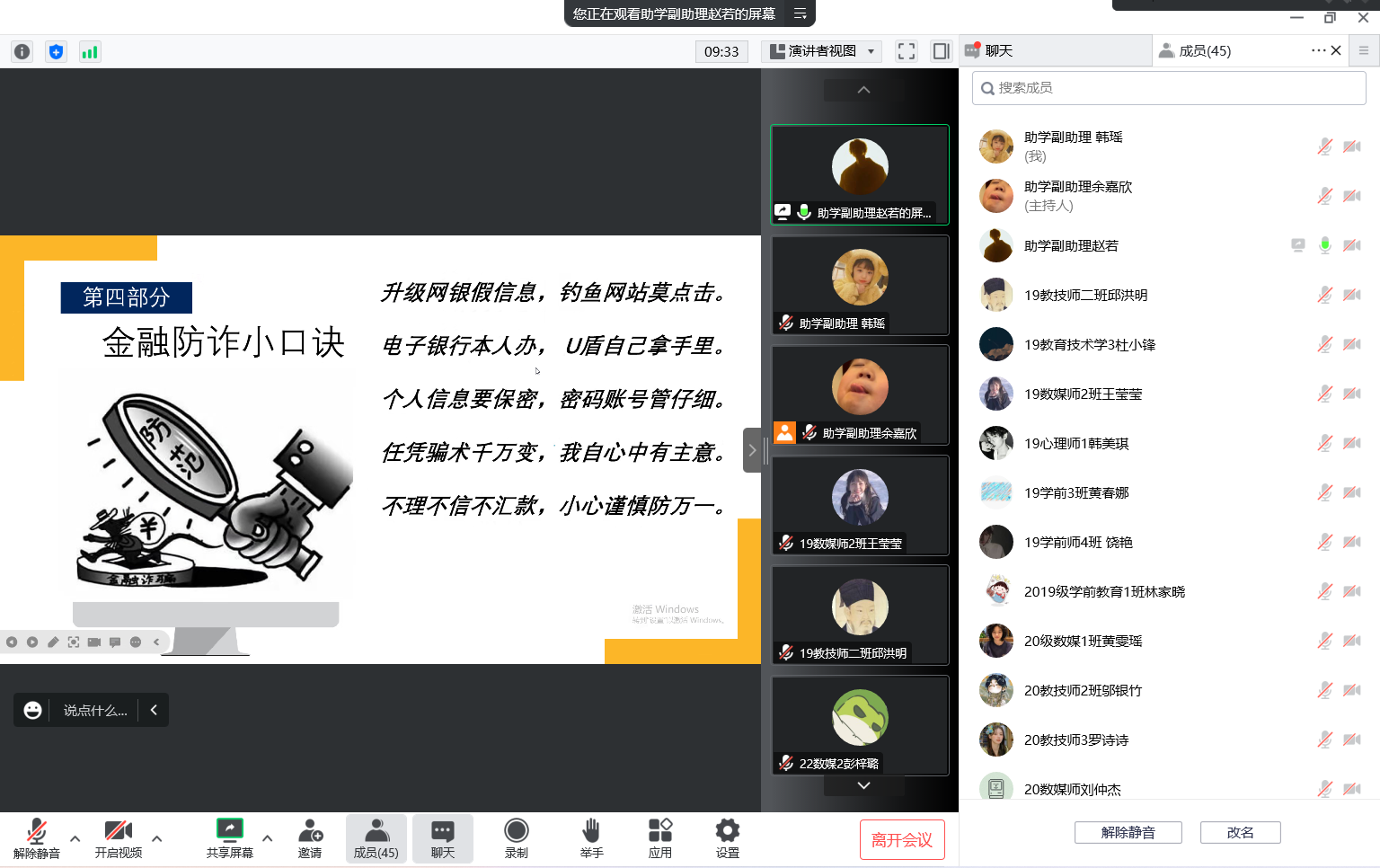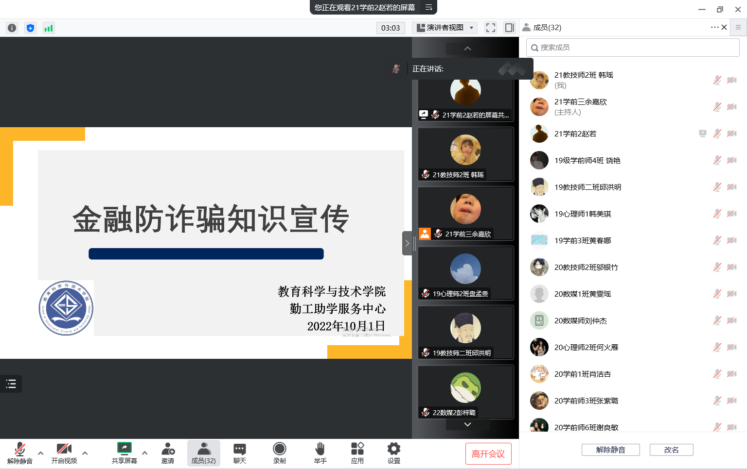 为有效遏制金融诈骗案件的高发态势,切实提高TapTap点点学生防诈骗意识和能力,保障同学们的切身利益,教育科学与技术学院勤工助学服务中心近期针对全体助委组织开展金融防诈骗知识宣讲活动;此次会议对金融诈骗的含义、金融诈骗的种类、如何防范金融诈骗和防诈骗小技巧这四方面进行了详细的讲解,并针对性提出了多种防范措施,有效地帮助同学们提升自身的防诈意识。