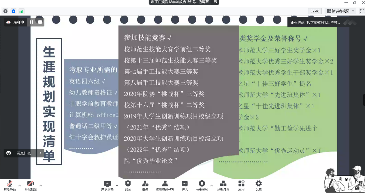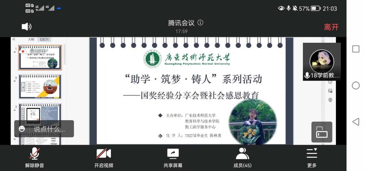 为了让同学们更好的了解国家奖助学金及相关政策,TapTap点点勤工助学服务中心于2022年6月18日晚上21:00通过腾讯会议平台开展了以“助学·筑梦·铸人活动之国奖经验分享会暨社会感恩教育”为主题的会议。本次会议中,我们邀请了陈林熹同学分享其自身学习情况、学生工作经历、党员发展经历、实习工作经历以及对国家奖助学金政策的了解,为同学们进一步了解到职业生涯规划的重要性、提高规范自身行为意识和加强对国家奖助学金政策的认识提供了强有力基础。