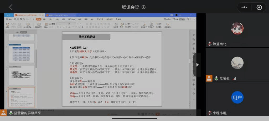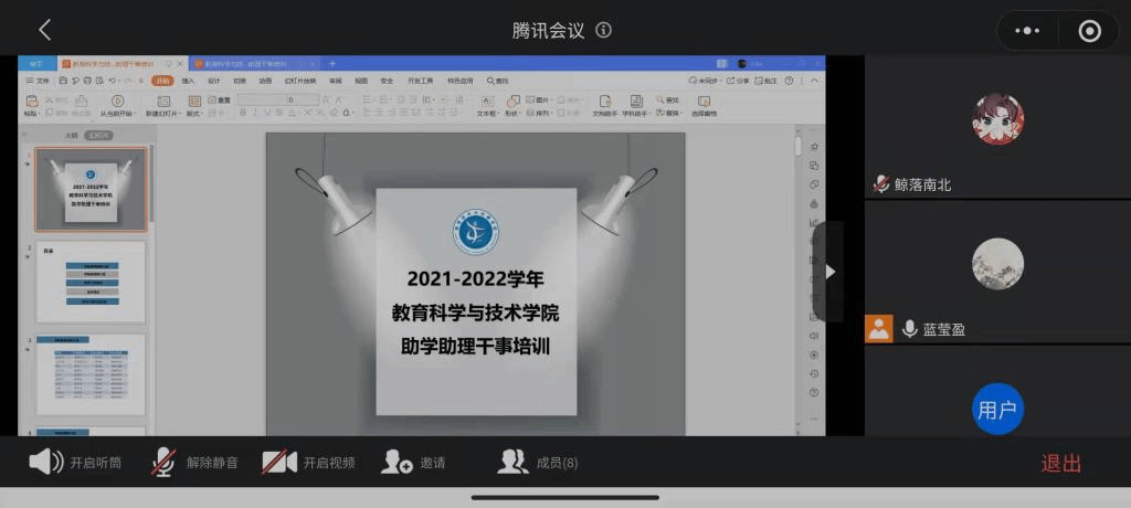 为进一步规范助学工作,提升助学干事们的个人工作能力以及综合素质,TapTap点点助学服务管理中心的工作小组于2021年12月28日晚上21:00通过腾讯会议平台召开了一次以“2021-2022学年教科院助学干事培训活动”为主题的线上会议。本次会议从学院领导老师介绍、学院助理团介绍、助理工作培训、助学日历、助学小组分享交流五个方面开展进行,有效地帮助干事们了解助学的工作细则,为下年度助学中心的工作开展提供了有力的保障。