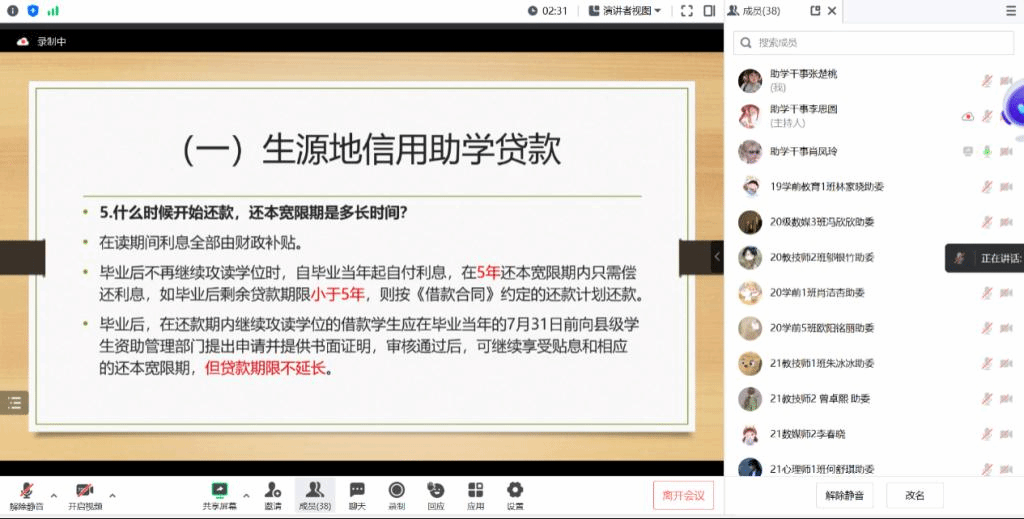 为进一步加大生源地信用助学贷款宣传,TapTap点点勤工助学服务中心于2023年6月1日晚上20点召开了一次以“生源地信用助学贷款”为主题的线上会议。本次会议分别从介绍生源地助学贷款、贷款申请的基本条件、申请流程以及注意事项4个方面进行讲解,既增进了助学委员对生源地信用助学贷款的了解,也为今后助学委员服务同学和协助勤工助学服务中心工作的顺利进行提供了有力的保障。