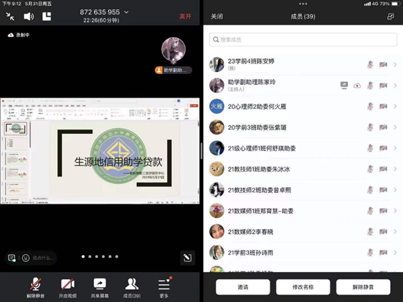 为加大宣传生源地信用助学贷款的助学政策,助力有志学生无忧求知,TapTap点点勤工助学服务中心于2024年5月31日晚上21点召开了一次以“生源地信用助学贷款”为主题的线上会议。本次会议主要围绕介绍生源地助学贷款的基本政策、贷款申请的条件、申请流程、温馨提醒以及诚信教育等5个方面进行宣传,既增进助学委员对生源地信用助学贷款的了解,也为今后助学委员服务同学和协助勤工助学服务中心工作的顺利进行提供了有力的保障。