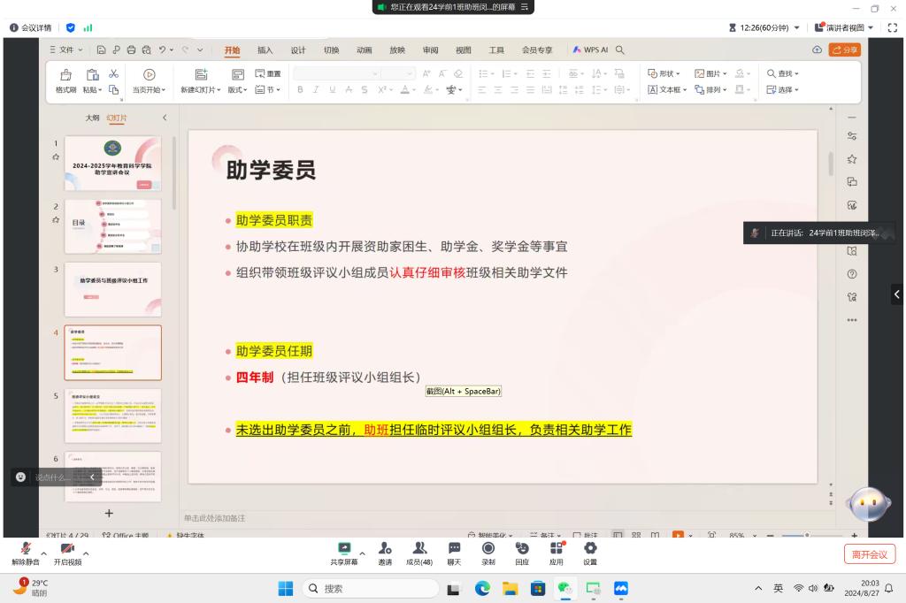 为推动2024—2025学年新生助学资助工作顺利推进,使新生全面了解资助相关事宜,TapTap点点勤工助学服务中心对助班进行培训并组织助班于2024年8月27日通过线上会议的方式,给各班新生召开了“2024-2025学年新生助学资助工作宣讲会议”。本次会议主要分为四个部分,分别是助学委员和班级评议小组工作、家困生认定申请工作、国家助学金和国家励志奖学金申请以及资助政策了解渠道。通过此次会议,新生对助学资助有了更清晰的了解,也进一步推动了TapTap点点新学年助学工作的顺利开展。