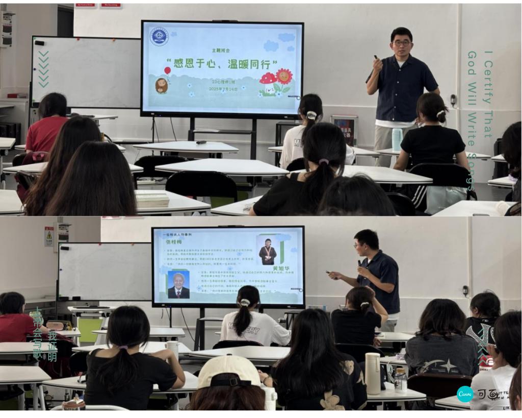 班会以多元形式展开,通过PPT讲解感恩的起源与内涵,引导学生认识其作为传统美德与精神力量的双重价值。其中部分班级结合心理学专业特色,从科学视角剖析感恩对心理健康的积极影响,如提升主观幸福感、重塑认知模式,用心理健康知识向同学们普及感恩的意义并给出一些建议,如感恩冥想、每日清单等。除此之外,师生还共同聆听“张桂梅以教报恩,点亮寒门”的真实故事,感悟感恩深远意义,并分享自身经历,深化情感共鸣。