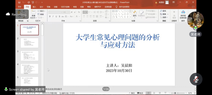 吴晨阳老师以《大学生常见心理问题的分析与应对方法》为主题,详细介绍了目前大学生的心理特点和常见的心理问题,并结合自身学生工作经验,共同探讨了心理健康对学生学习和发展的影响,此外,指导心理委员如何进行心理危机的识别与正确的危机处理结合前期汇报,老师了解心理委员和各年级各班级的现状,并传授了运用心理咨询原理和技巧进行沟通的方法,鼓励心理委员运用于日常工作之中。