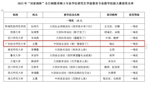 近日,由全国教育专业学位研究生教育指导委员会主办、南京师范大学承办的2022年全国“田家炳杯”全日制教育硕士专业学位研究生学前教育专业教学技能大赛决赛落下帷幕,我校教育科学与技术学院2021级学前教育专业学位研究生王霞在该项赛事中脱颖而出,荣获一等奖。其导师陶红教授荣获“优秀指导教师奖”。