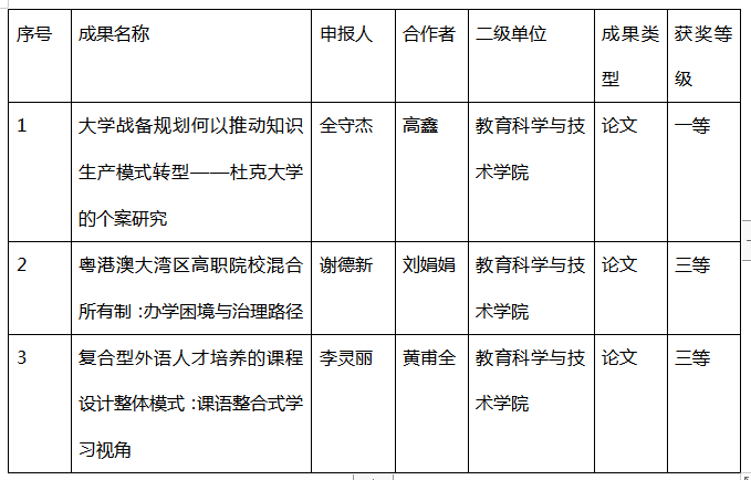 10月17日,根据《广东省高等教育学会第二届高等教育研究优秀成果奖拟获奖名单》的公示信息,我院有3项相关成果获奖。
