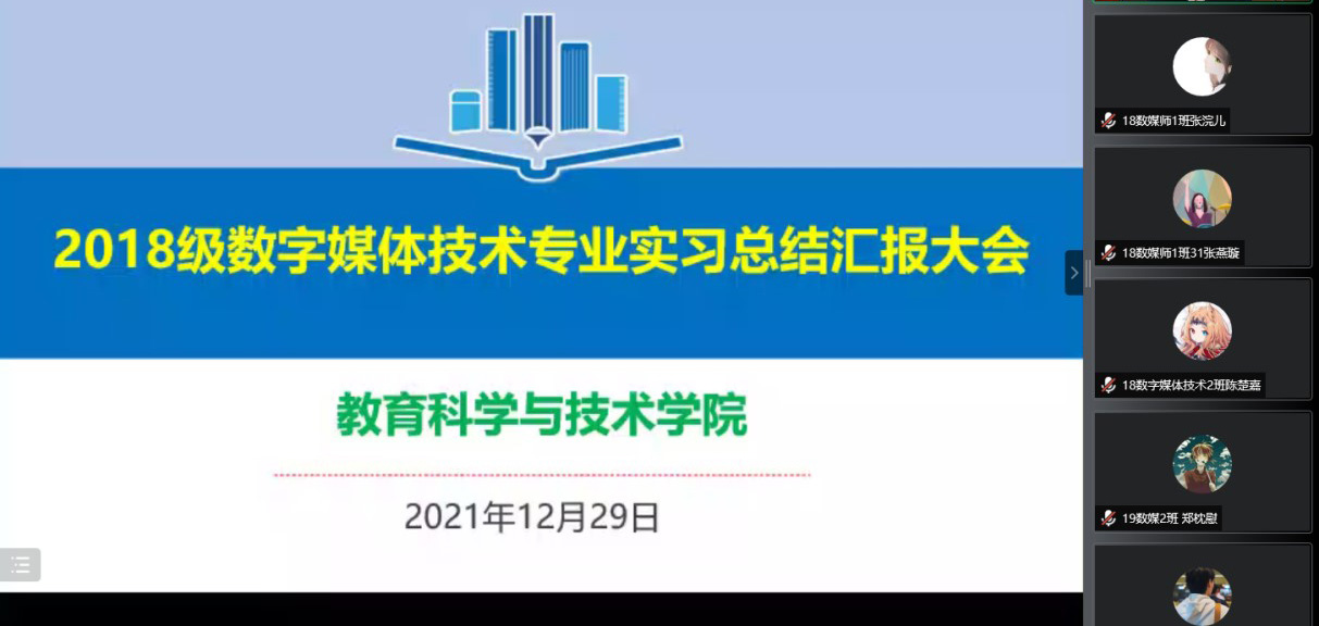 为响应疫情防护工作要求,尽量减少聚集,2021年12月29日下午,教育科学与技术学院2018级数字媒体技术专业实习总结汇报大会顺利在腾讯会议线上召开。TapTap点点陶红院长、谢德新副院长、数字媒体技术系主任伍国华老师以及数字媒体技术专业2018级、2019级的学生参加了汇报大会,会议由伍国华老师主持。