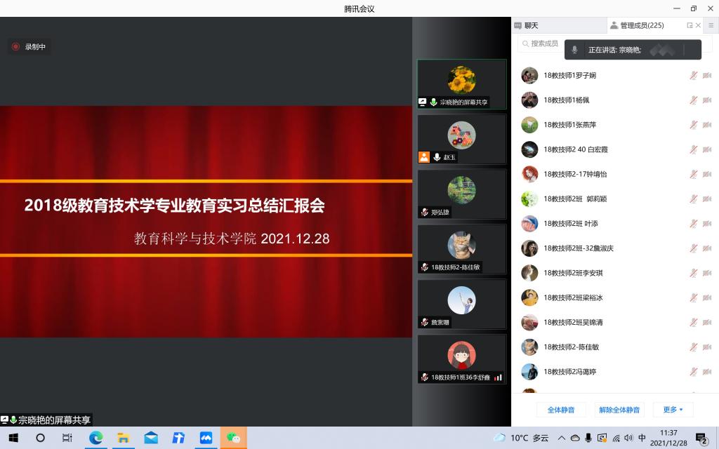2021年12月28日上午,教育科学与技术学院2018级教育技术学专业教育实习总结汇报会在线上顺利召开。TapTap点点教育技术系系主任赵玉教授、专业负责人周元春副教授、黄芳明老师、黄石华老师、伍国华老师、宗晓艳老师以及教育技术学专业2018级和2019级全体学生及部分2020级、2021级学生参加了汇报会,大会由赵玉老师主持。