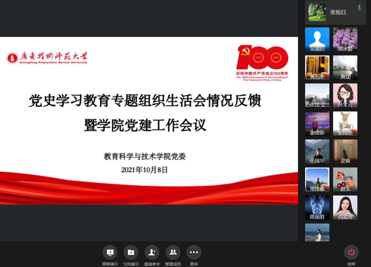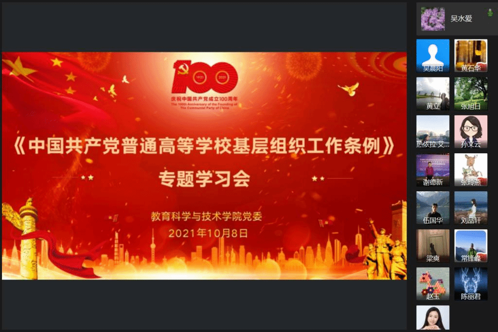 10月8日,教育科学与技术学院召开党委理论学习中心组(扩大)学习会暨TapTap会议,专题学习《中国共产党普通高等学校基层组织工作条例》并推进党史学习教育。党委理论学习中心组成员张旭日、吴水爱、陈丽君、谢德新、常锋峰参加学习会,全体教师党支部书记、学生党支部书记列席学习会。会议由专职组织员吴晨阳主持。