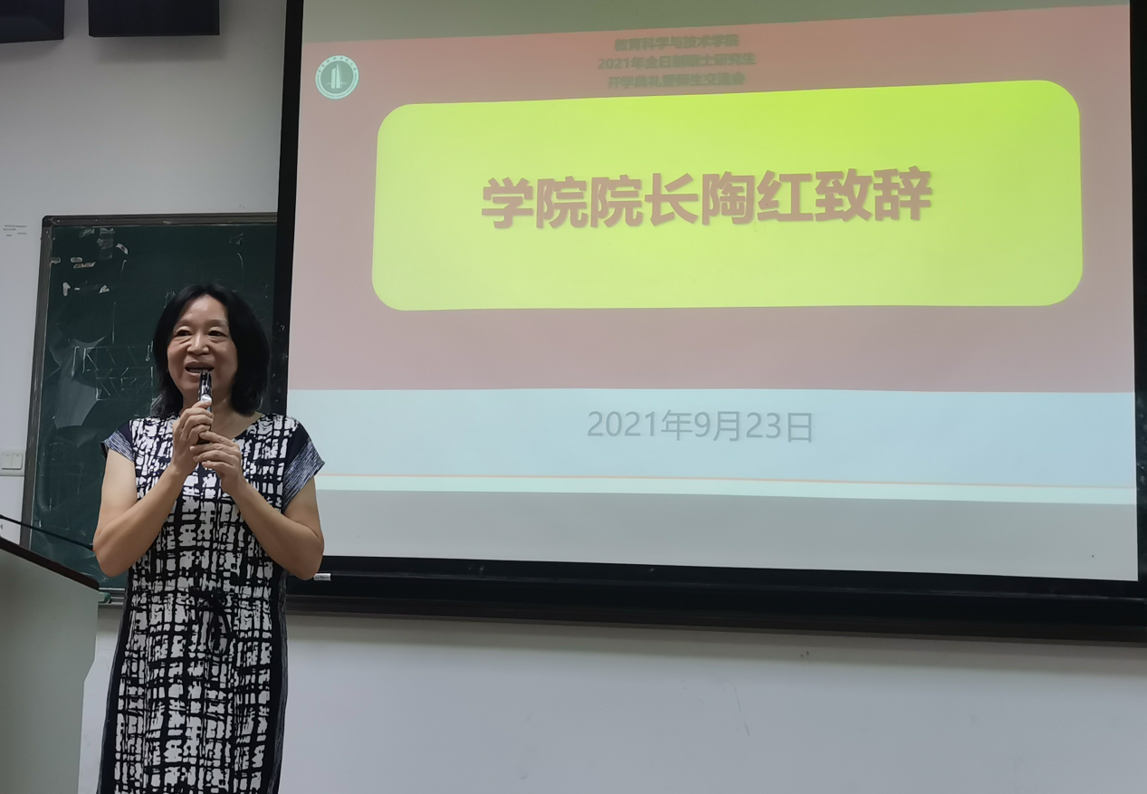 陶红院长代表学院致欢迎词,欢迎2021级硕士研究生新生加入到教科院的大家庭中,在这个大家庭中会尽力爱护、帮助和支持同学们的学习与生活,成为同学们坚强的后盾,使同学们对于学院这个大家庭有真正的归属感。此外,还对同学们提出三点要求,第一,态度;第二,时间;第三,行动。要求同学们统筹规划好这三方面,提升自己的核心竞争力,通过集体的努力,共同建设,迈向美好的明天,最后,陶院长期待并祝愿大家在广师大有一段不同的人生经历,学有所成,克服一切困难,以阳光的心态度过每一天。