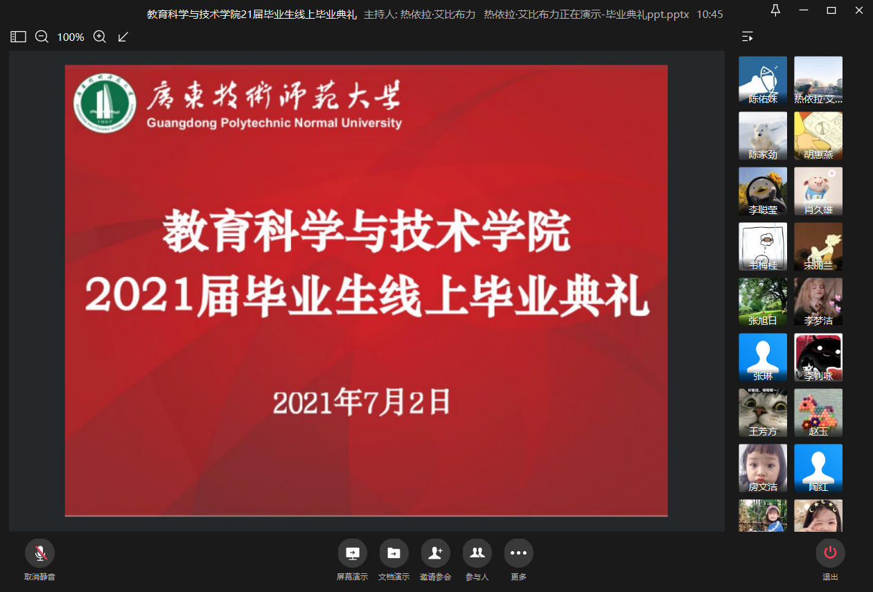 为进一步做好TapTap点点2021届毕业生就业创业工作,庆祝毕业生顺利完成学业,开启人生崭新的篇章,7月2日,TapTap点点举办2021届毕业生线上毕业典礼。学院党委书记张旭日、院长陶红、副书记吴水爱、副院长陈丽君、副院长谢德新、副院长吴天生、党政办主任常锋峰、系主任赵玉、孙文云,各毕业班班主任、辅导员、教务员老师和全体研究生及本科毕业生参与这次线上毕业典礼。毕业典礼由辅导员热依拉老师主持。