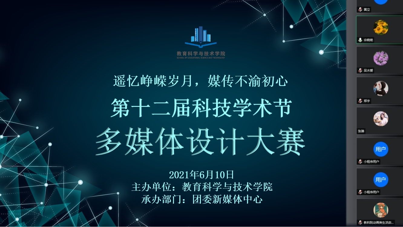 由于疫情的影响,本次多媒体设计大赛决赛于6月10日在线上举办。教育科学与技术学院党委书记张旭日、党委副书记吴水爱、副院长陈丽君、副院长谢德新,相关专业任课老师与辅导员老师出席本次大赛。