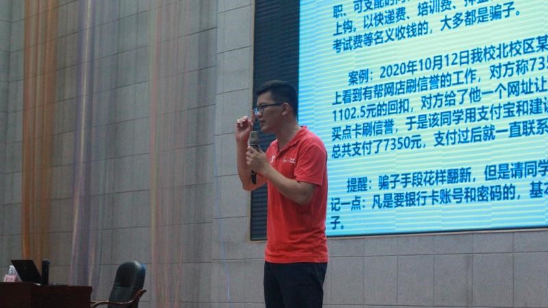 为加强新生校园安全意识,构建和谐稳定校园,10月15日晚,教育科学与技术学院于白云校区学生活动中心举办2020级新生国家安全教育暨预防电信诈骗知识讲座。本次讲座特邀学校保卫处管文彪老师开讲,新生辅导员、2020级全体学生五百余人聆听了本次讲座。讲座由吴晨阳老师主持。
