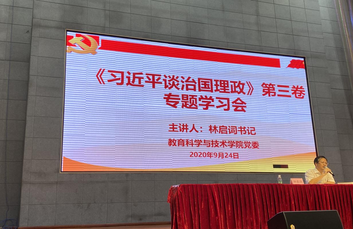 9月24日,教科院党委书记林启词与在白云校区学生活动中心与同学们一起学习《习近平谈治国理政》第三卷。他说,党的十八大以来,在治国理政新的实践中,习近平总书记发表了一系列重要讲话,提出了许多新思想新观点新论断,集中展示了以习近平同志为核心的党中央治国理念和执政方略。《习近平谈治国理政》一书,将习近平同志92篇报告、讲话、谈话、演讲、批示等归纳为19个专题精辑成书,希望同学们认真学习细致深入阅读习近平总书记重要文稿,这对我们在新时代条件下中国发展的重大理论和现实问题有了更加全面系统的了解。希望同学们在校期间坚定理想信念,树立远大理想,筑牢责任意识与奋斗精神,充分利用学院提供的优质教育资源夯实专业本领,明确时代责任和历史使命,弘扬伟大的抗疫精神,准确找到自己成才的目标和方向,在时代大潮中建功立业,为实现中国梦奉献属于自己的一份力量。