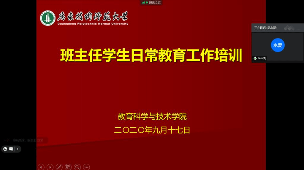 为深入贯彻落实全国和广东省委教育工委2020年高校思想政治工作会议精神,不断加强学院班主任队伍建设,进一步提高班主任的心理教育能力和水平,促进学院德育工作整体发展,9月17日晚,教育科学与技术学院党委特邀学生工作部(处)心理健康教育与咨询中心王明粤老师为学院全体班主任开展班主任学生日常教育(心理)工作培训会,全面提升班主任的理论素养和业务水平。学院党委吴水爱副书记、全体辅导员老师同时参加会议。