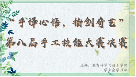 疫情限制了同学们的脚步,却无法限制他们的奇思妙想。为了使相关专业的学生从实践中锻炼自身技能,同时也能丰富教科院同学们的课余文化艺术生活,展现学院的艺术专业特色,教科院举办了以“手译心语,指创奇艺”为主题的手工技能大赛。比赛之初,同学们积极投稿,举办方征集到了许多别出心裁、妙趣横生的手工作品。本着公平公正的原则,评委们评选出了13份出色优异的作品。选手们将带着他们的作品,在决赛中进行激烈的比拼。