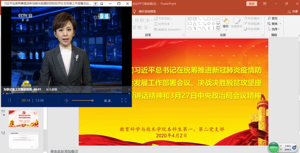 会前,支部委员会全体成员围绕学习主题,开展了自学,认真撰写了研讨发言材料。会上,大家紧密联系思想和实际,交流学习体会。随后,吴老师作了题为《携手战“疫”守初心,爱国力行担使命》主题微党课,带领全体与会党员回顾党和国家疫情防控以来的感人事迹和阶段性成效。紧接着,全体党员集体观看习近平总书记在统筹推进新冠肺炎疫情防控和经济社会发展工作部署会议、决战决胜脱贫攻坚座谈会以及3月27日的中央政治局会议上的重要讲话的新闻回播,共同领悟会议上习近平总书记提出毫不放松抓紧抓实抓细防控工作,统筹做好经济社会发展各项工作的重要决策意义,深入体会党和国家对打赢这场疫情防控阻击战的信心和决心。