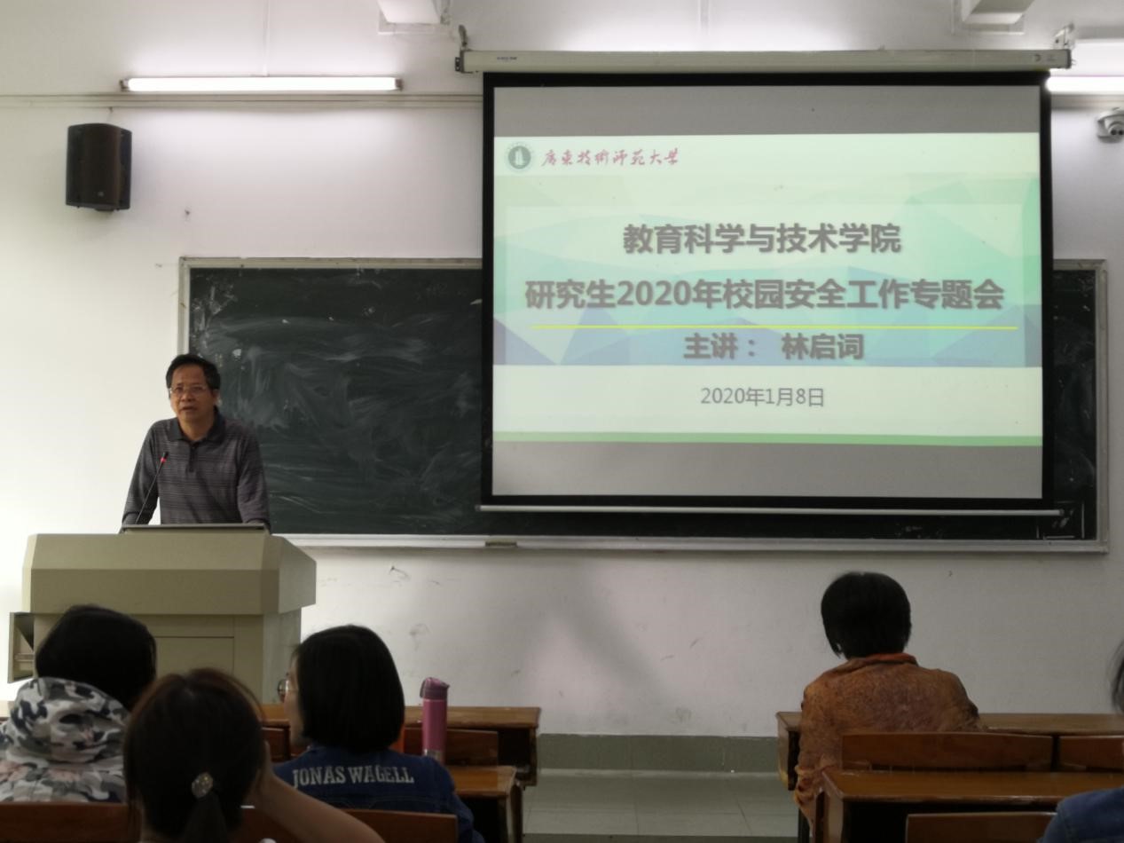 党委书记林启词为全体研究生作加强思想政治工作建设、校园安全教育的讲话。他要求同学们认真学习党的十九届四中全会精神,深刻领会坚持和完善中国特色社会主义制度、推进国家治理体系和治理能力现代化的精神。他说,安全工作是学校的头等大事,首先要求全体同学提高安全防范意识、严格遵守学校各项安全工作制度。针对当前的安全形势,研究生要进一步提高政治站位,增强安全意识,树立高度的责任感,进一步增强“四个意识”,坚定“四个自信”,以“两个维护”作为指导学习和工作开展的行动指南,把爱国奉献的热情转化为创新创造的不竭动力,要时刻用爱国奋斗精神鼓舞自己,为实现中华民族伟大复兴中国梦贡献智慧和力量。他强调研究生要规范微信、微博、公众号等融媒体平台的使用,远离邪教,做到不传谣、不信谣,大力传播正能量。要求全体研究生要严格遵守学校的各项管理规定,学生外出参加学习学术活动、实习等必须经过导师签名批准和向学院报备,进一步规范日常管理等各环节。林书记告诫全体研究生:为了自己和自己身边的人,要爱惜自己的身体,注意自己的安全,预防身边的隐患,避免“万一”事件发生,特别是回家路途比较遥远的同学,旅途过程中更要提高警惕。