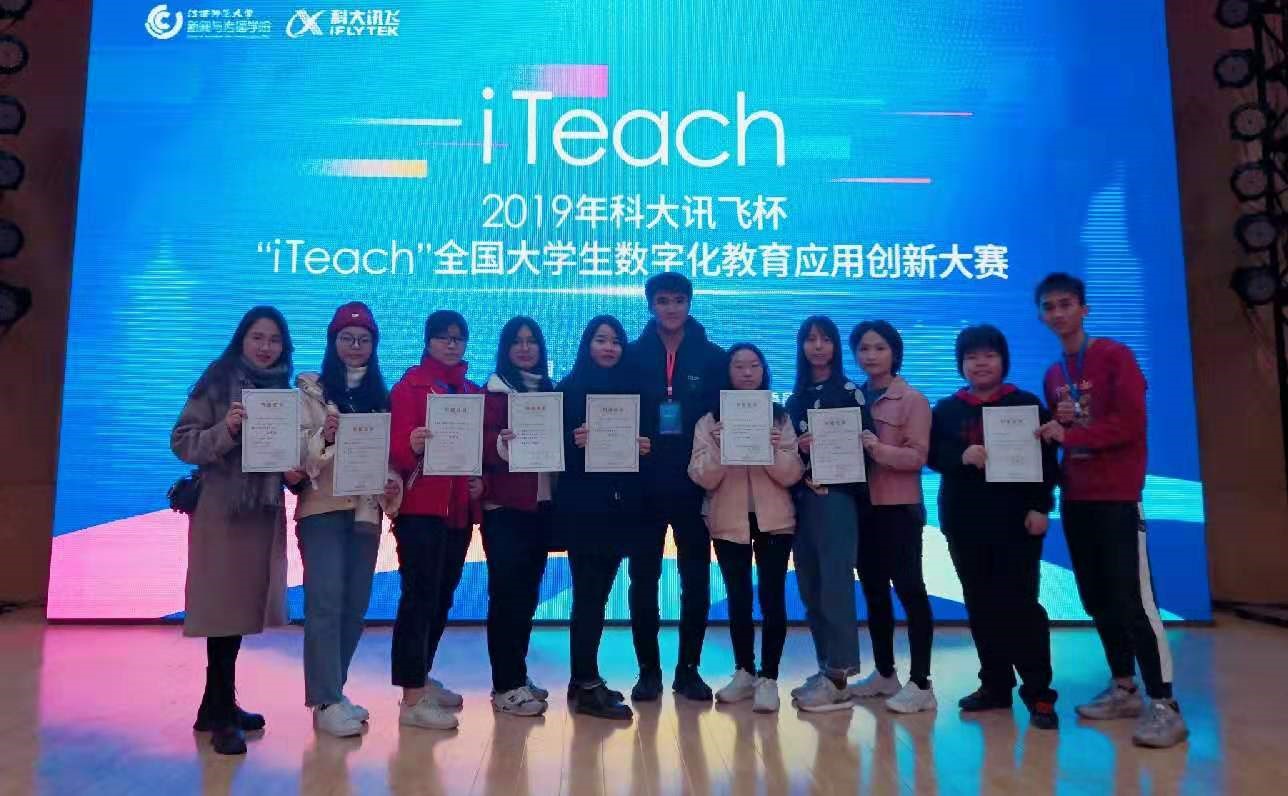 2019年12月22日,第三届科大讯飞杯"iTeach"全国大学生数字化教育应用创新大赛决赛日前在江西师范大学落下帷幕。经过严格的网络评审、激烈的现场答辩,我校教育科学与技术学院获得一等奖1项,二等奖4项,三等奖12项,陈军老师、吴仕云老师获得“优秀指导老师”奖。我校获“优秀院校组织”奖。