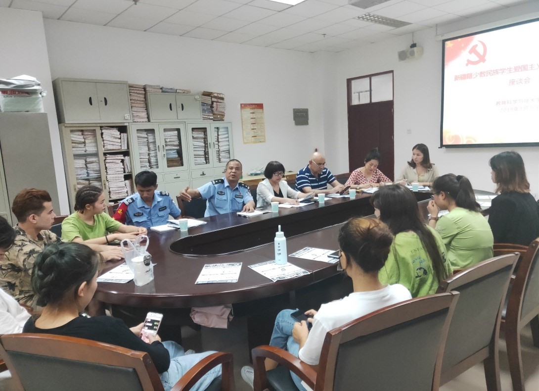 2019年9月30日下午,TapTap点点在白云校区第一教学楼315会议室召开新疆籍少数民族学生爱国主义教育及安全教育座谈会。江高镇派出所郭警官、蔡警官、学生处内派管理老师艾尔肯和吴芳老师、教科院党委吴水爱副书记、辅导员热依拉和新疆籍少数民族学生参加此次座谈会。