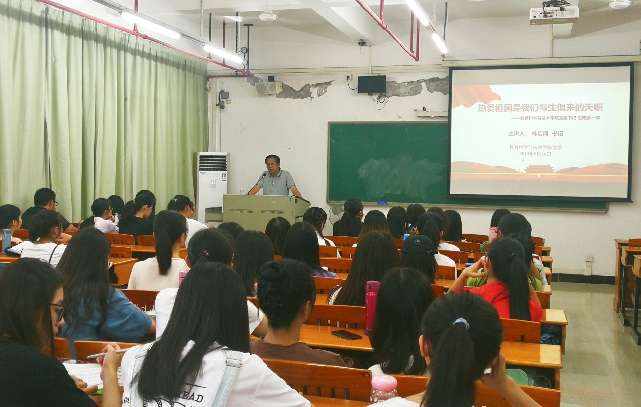 9月26日,在伟大的中华人民共和国成立70年之际,教科院党委书记林启词给师生上思政第一课。在“热爱祖国是我们与生俱来的天职”的讲座中,他与同学们一起回顾中华人民共和国成立70年来取得巨大的成就。他说, 1921年中国共产党诞生后,深刻改变了近代以后中华民族发展的方向和进程,深刻改变了中国人民和中华民族的前途和命运,深刻改变了世界发展的趋势和格局。