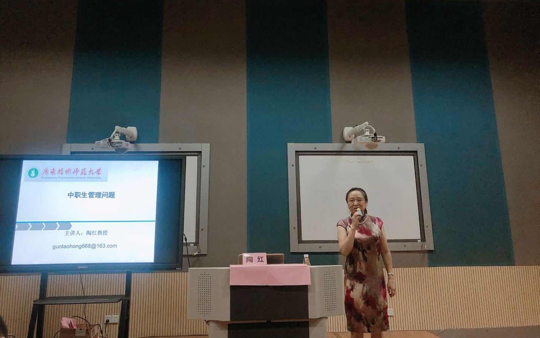 教育科学与技术学院院长陶红教授以《中职生管理问题》为主题,从中职生管理的困惑入手,分析中职学生的特点、存在的问题,并提出管理的心理策略,结合案例生动地介绍了中职教师在日常教学活动中所扮演的角色、不同类型的教师对学生产生的影响、班主任工作方法以及如何成为学生喜欢的教师,对学员了解中职生以及未来管理中职生,提供了重要的参考。
