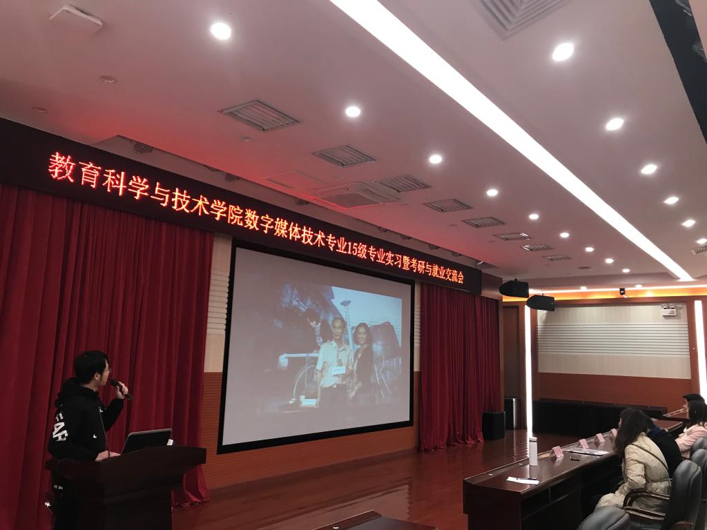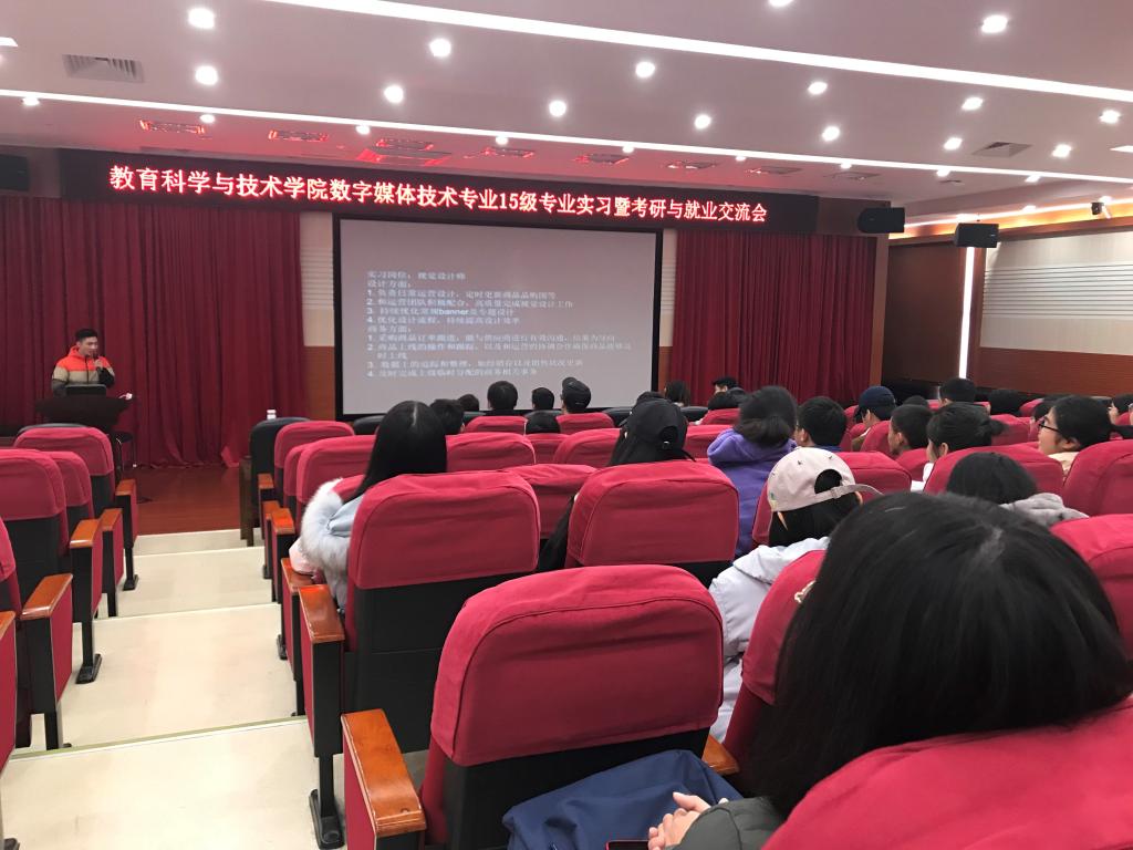 2019年1月3日上午,教育科学与技术学院数字媒体技术系的师生在白云校区三教讲学厅举行了2015级毕业生的专业实习暨考研与就业交流会。本次交流会由系主任陈雪梅老师主持。数字媒体技术系专业老师及辅导员出席了本次交流会。